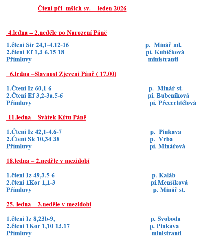 Rubriky Aktuality Čtení při nedělních mších sv. Autor příspěvku Autor: Miloš Pinkava Datum příspěvku 29. 12. 2025 ← Modlitby růžence