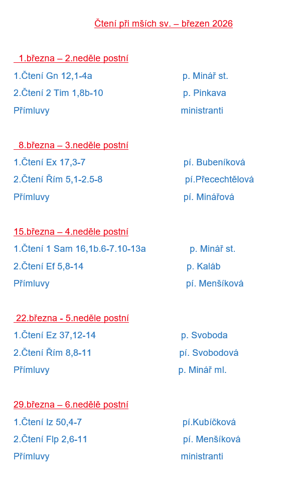 - Ve středu při mši sv. v 17:00 se bude žehnat a udělovat popelec.